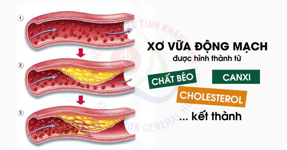 Bệnh tiến triển âm thầm khi chất béo, canxi và cholesterol tích tụ trong thành mạch máu, hình thành mảng xơ vữa làm hẹp lòng mạch, cản trở dòng máu nuôi tim và não.