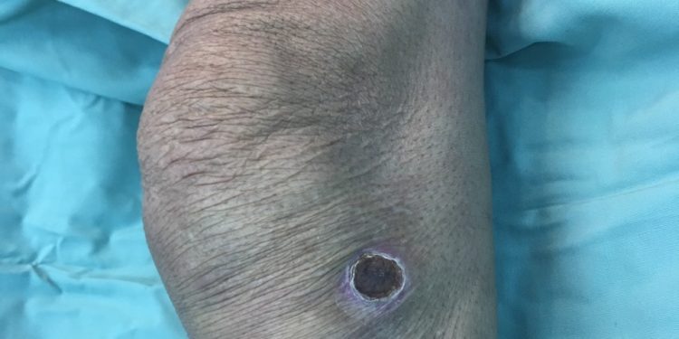 BN Nguyễn C. nhập BVĐK tỉnh Khánh Hòa vào tối ngày 22/7/2019 trong tình trạng sốt cao trong 3 ngày, sưng đau nhiều vùng đùi trái, yếu 2 chân, khó thở. BS đã đánh giá tiêu điểm nhiễm trùng kín đáo từ vết thương nhỏ vùng gối (T). BN được hồi sức tích cực và thực hiện các cận lâm sàng cần thiết để chẩn đoán xác định. Kết quả cho thấy, BN bị tràn khí dưới da vùng đùi trái, phù nề mô mỡ dưới da mặt trong đùi trái, tụ khí các bao cơ vùng mặt trong đùi trái, xơ vữa vôi hóa động mạch (ĐM) chi dưới 2 bên, mảng xơ vữa gây hẹp lòng ĐM chi dưới (T), tắc động mạch chày trái, được hội chẩn kết luận HOẠI THƯ SINH HƠI ĐÙI (T).