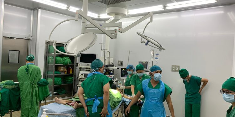 Thực hiện Quy trình báo động đỏ, nhận được thông tin từ Bệnh viện Đa khoa khu vực Cam Ranh, ê kíp cấp cứu, phẫu thuật viên khoa Ngoại Tổng quát, Gây mê hồi sức và các bộ phận có liên quan đã chuẩn bị sẵn sàng đón bệnh nhân. Bệnh nhân được tiếp nhận, hồi sức và nhanh chóng chuyển lên phòng mổ lúc 02h00 ngày 05/11/2021. Ê kíp phẫu thuật vết thương thận do BSCKII. Tôn Thất Minh Thuyết – Trưởng kíp đảm nhận kéo dài đến 05h00′ sáng. Tiếp theo ê kíp phẫu thuật tiêu hóa do BSCKII. Đỗ Hoài Kỷ xử lý, khâu ruột non, nối D2 tá tràng, làm hậu môn nhân tạo đại tràng ngang. Lúc 8h30′ cùng ngày, bệnh nhân được chuyển về đơn vị Hồi sức Ngoại theo dõi và điều trị hậu phẫu tích cực. Trong quá trình phẫu thuật và điều trị, bệnh nhân đã được truyền 32 đơn vị máu và các chế phẩm của máu, cùng nhiều loại dịch truyền khác.