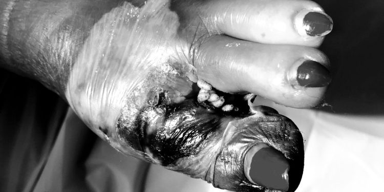 Bệnh nhân Phan Thị Kim H. 75 tuổi, sống tại Cam Lập, Cam Ranh. Bệnh nhân có tiền sử đái tháo đường tuýp 2, glucose máu 8.9mmol/L, bạch cầu 17.95G/L (ngày nhập viện). Bệnh nhân có vết thương ngón chân cái bàn chân trái, bệnh nhân đắp lá không rõ loại. Sau đó vết thương nhiễm trùng hoại tử, nhiều mủ xanh và mùi hôi thối, có nhiều con dòi lúc nhúc ở vết thương. Vào viện, BS phải tháo bỏ ngón cái cho bệnh nhân vào ngày 5/6/2021.