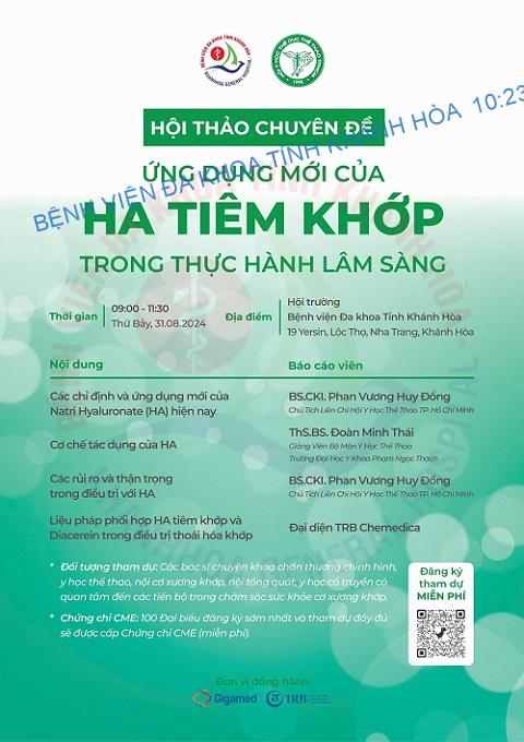 Nhằm cập nhật những khía cạnh mới, đồng thời thảo luận và chia sẻ kinh nghiệm trong việc sử dụng HA, Bệnh viện Đa khoa tỉnh Khánh Hòa phối hợp Liên chi hội Y học Thể dục thể thao TP. Hồ Chí Minh tổ chức Hội thảo khoa học “Ứng dụng mới của Hyaluronic Acid tiêm khớp trong thực hành lâm sàng”.