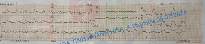 Bệnh nhân nam L.V.V, 56 tuổi (số nhập viện 37898), tiền căn tăng huyết áp kèm hút thuốc lá, vào Trung tâm Y tế huyện Vạn Ninh vì đau ngực trái vã mồ hôi kèm khó thở, đo điện tâm đồ gợi ý nhồi máu cơ tim cấp vùng trước rộng, được xử trí cấp cứu và chuyển lên Bệnh viện Đa khoa tỉnh Khánh Hòa.