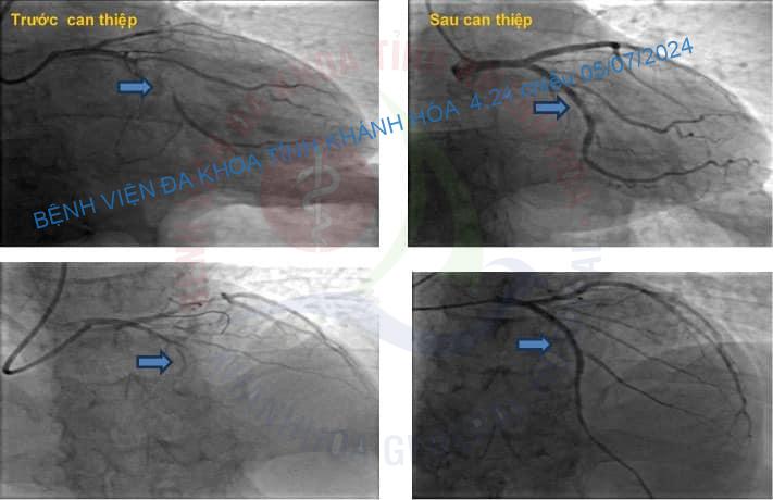 Ekip bác sĩ tại Khoa Cấp cứu đã nhanh chóng phối hợp cùng với Khoa Tim mạch Can thiệp tiến hành kịp thời hồi sức tim phổi cho bệnh nhân và ghi nhận bệnh nhân nhồi máu cơ tim cấp rất nặng. Sau hồi sinh tim phổi, bệnh nhân được duy trì huyết động với thuốc vận mạch liều cao, giúp thở qua ống nội khí quản. Tiến hành hội chẩn với ekip can thiệp mạch vành, khẩn trương vừa bóp bóng vừa chụp và can thiệp mạch vành cấp cứu. Kết quả chụp mạch vành cho thấy tắc hoàn toàn hai nhánh động mạch vành phía bên trái và tiến hành tái thông khẩn trương hai nhánh mạch vành bị tắc. Sau can thiệp, huyết áp phụ thuộc vận mạch, có nhịp tự thở, tri giác cải thiện dần. Sau 1 tiếng, bệnh nhân được rút ống nội khí quản và hỗ trợ thở bằng oxy mask có túi dự trữ. Sau 12 tiếng, bệnh nhân được ngưng thuốc vận mạch và tỉnh táo hoàn toàn. Bệnh nhân được điều trị nội khoa tối ưu sau nhồi máu cơ tim cấp và được xuất viện sau 5 ngày.
