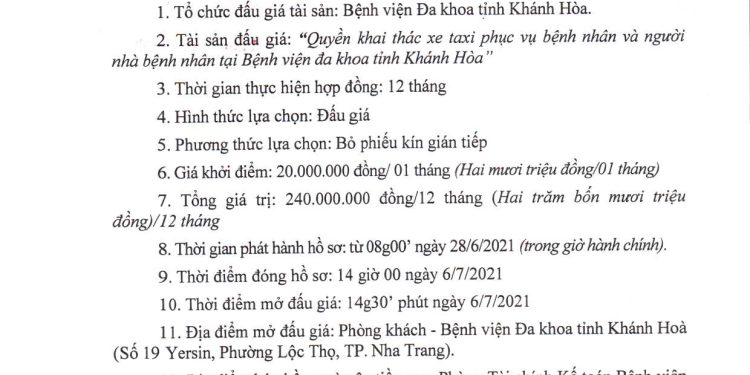 Thông báo đấu giá “Quyền khai thác xe taxi phục vụ bệnh nhân và người nhà bệnh nhân tại Bệnh viện Đa khoa tỉnh Khánh Hòa”